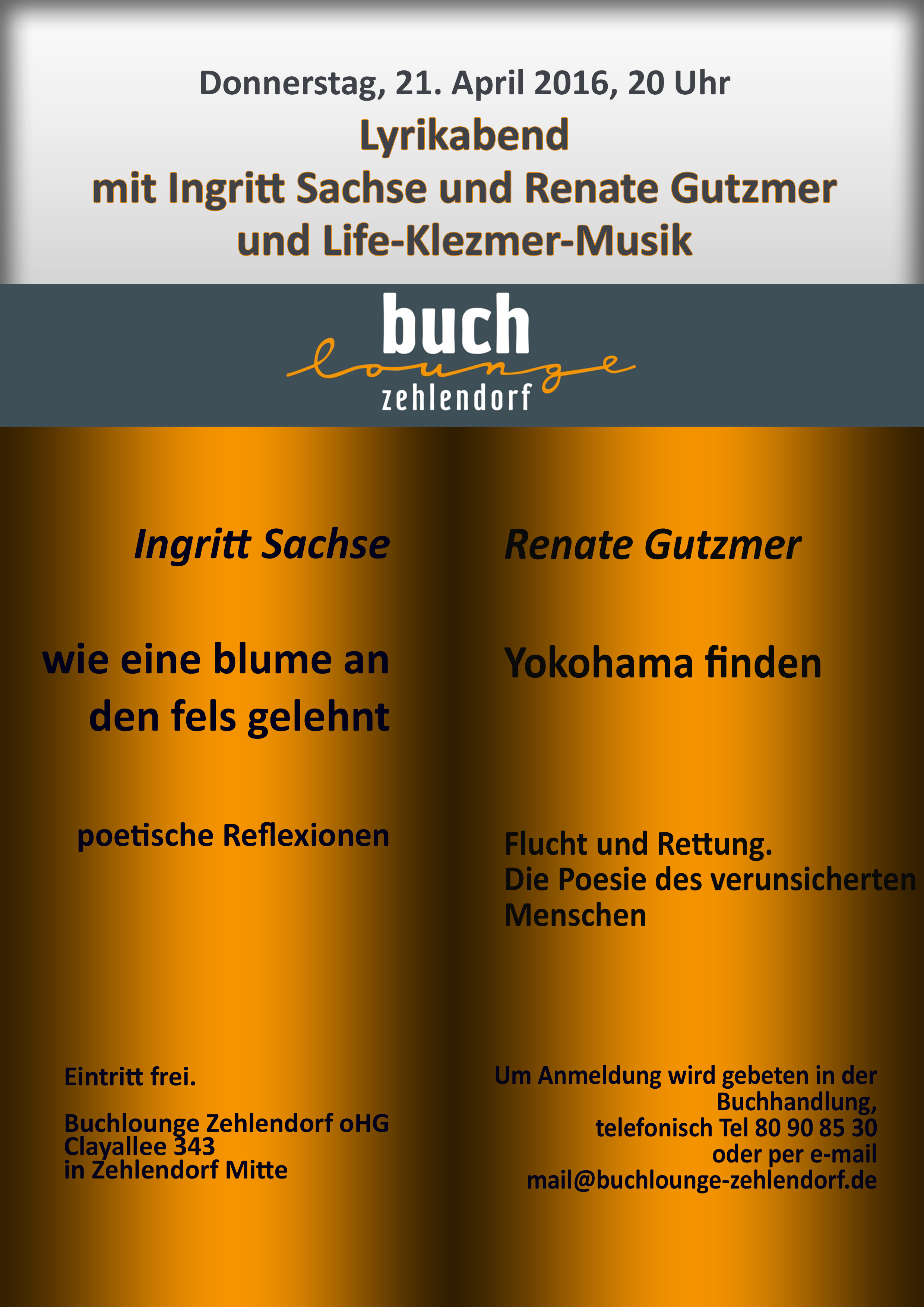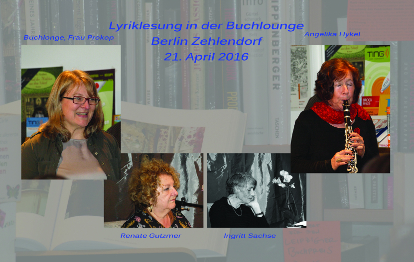 Lyriklesung in der Buchlounge Zehlendorf Clayallee 343 in 14169 Berlin am 21. April 2016, 20:00 Uhr ![]() | ||||||||||